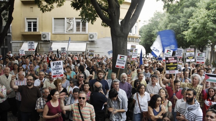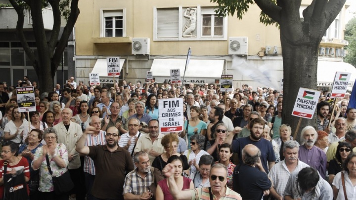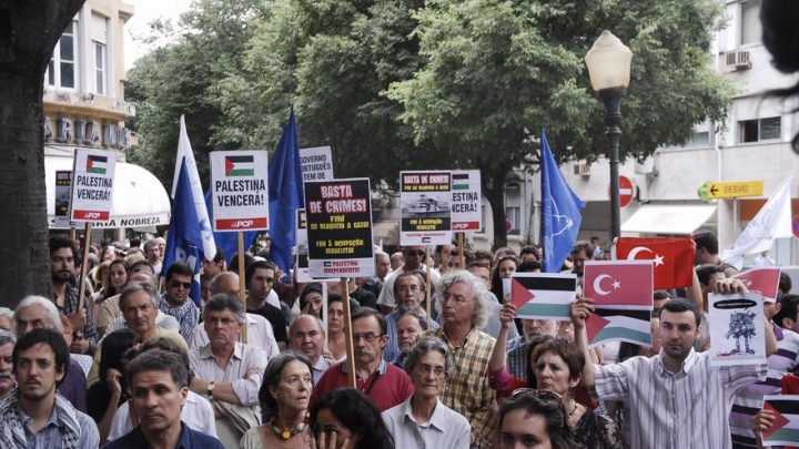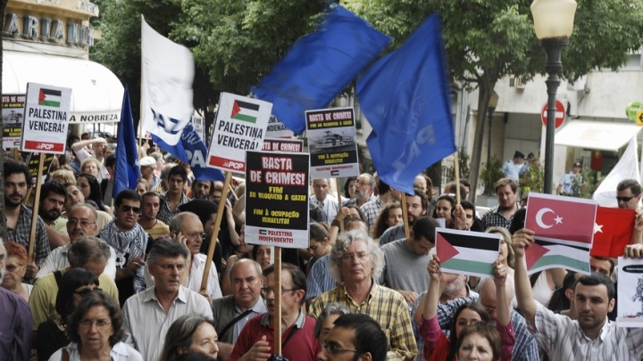 Centenas de pessoas manifestaram-se em Lisboa em frente à Embaixada de Israel numa concentração convocada por dezenas de organizações denunciando e exigindo a condenação de Israel pelo crime cometido contra o comboio naval humanitário com destino à Palestina.